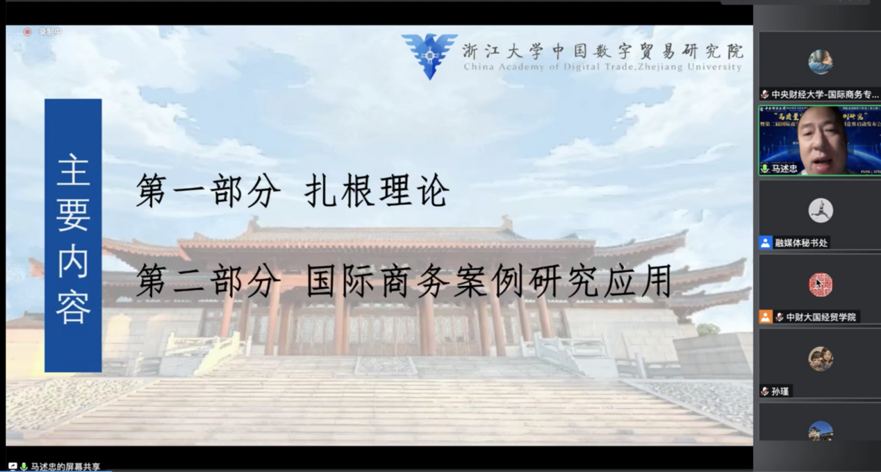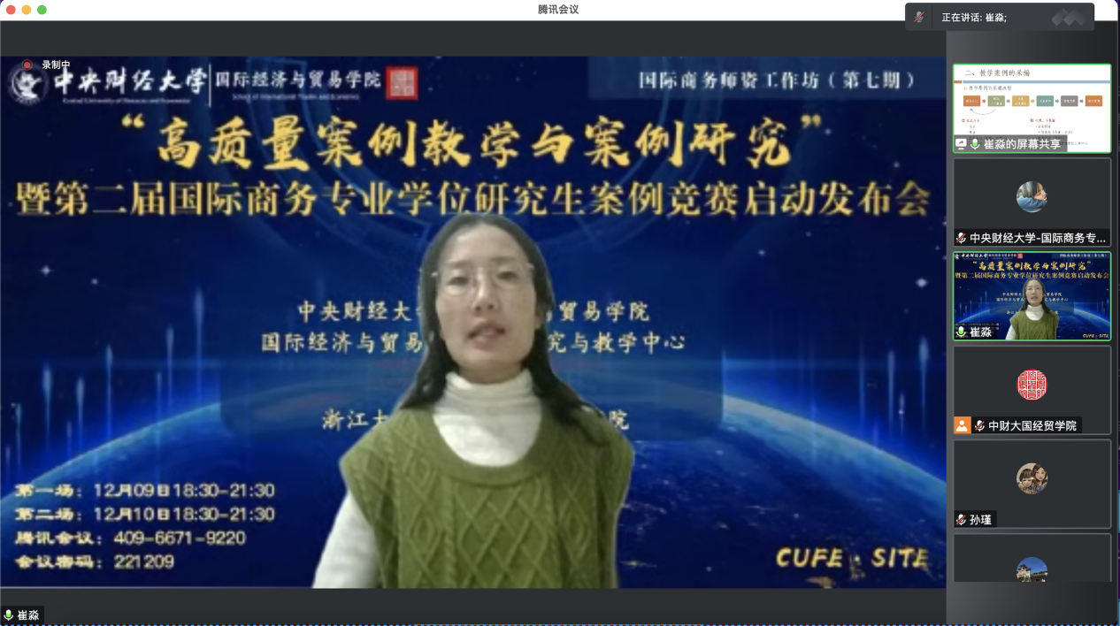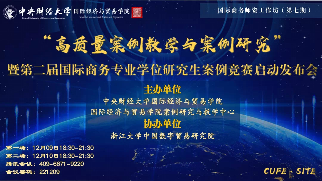 2022年12月9日晚、12月10晚,由tyc7111cc太阳成集团及tyc7111cc太阳成集团案例教学与研究中心主办、浙江大学中国数字贸易研究院协办的国际商务师资工作坊(第七期)——“高质量案例教学与案例研究”暨第二届国际商务专业学位研究生案例竞赛启动发布会在腾讯会议平台成功举办。