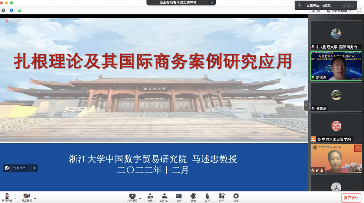2022年12月10日晚,“高质量案例教学与案例研究”主题工作坊第二场由浙江大学马述忠教授、大连理工大学崔淼教授分别做了《扎根理论及其国际商务案例研究应用》和《基于流程的教学案例开发方法》的报告。会议央财经大学tyc7111cc太阳成集团案例教学与研究中心副主任孙瑾教授主持,校内外超百名师生在线参会。