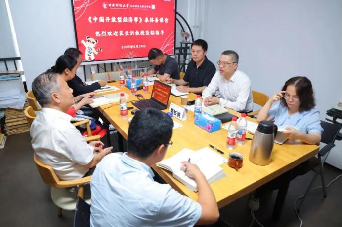 2025年8月28日下午,我院在学院13号楼401会议室举行《中国开放型经济学》课程集体备课会。会议由课程组负责人张晓涛院长主持,中国社会科学院经济研究所原所长、《中国开放型经济学》作者裴长洪教授应邀出席并作专题指导,刘悦、沈琪、纪珽、蒙双、钟腾龙、蒋海威等课程主讲教师参与交流研讨。