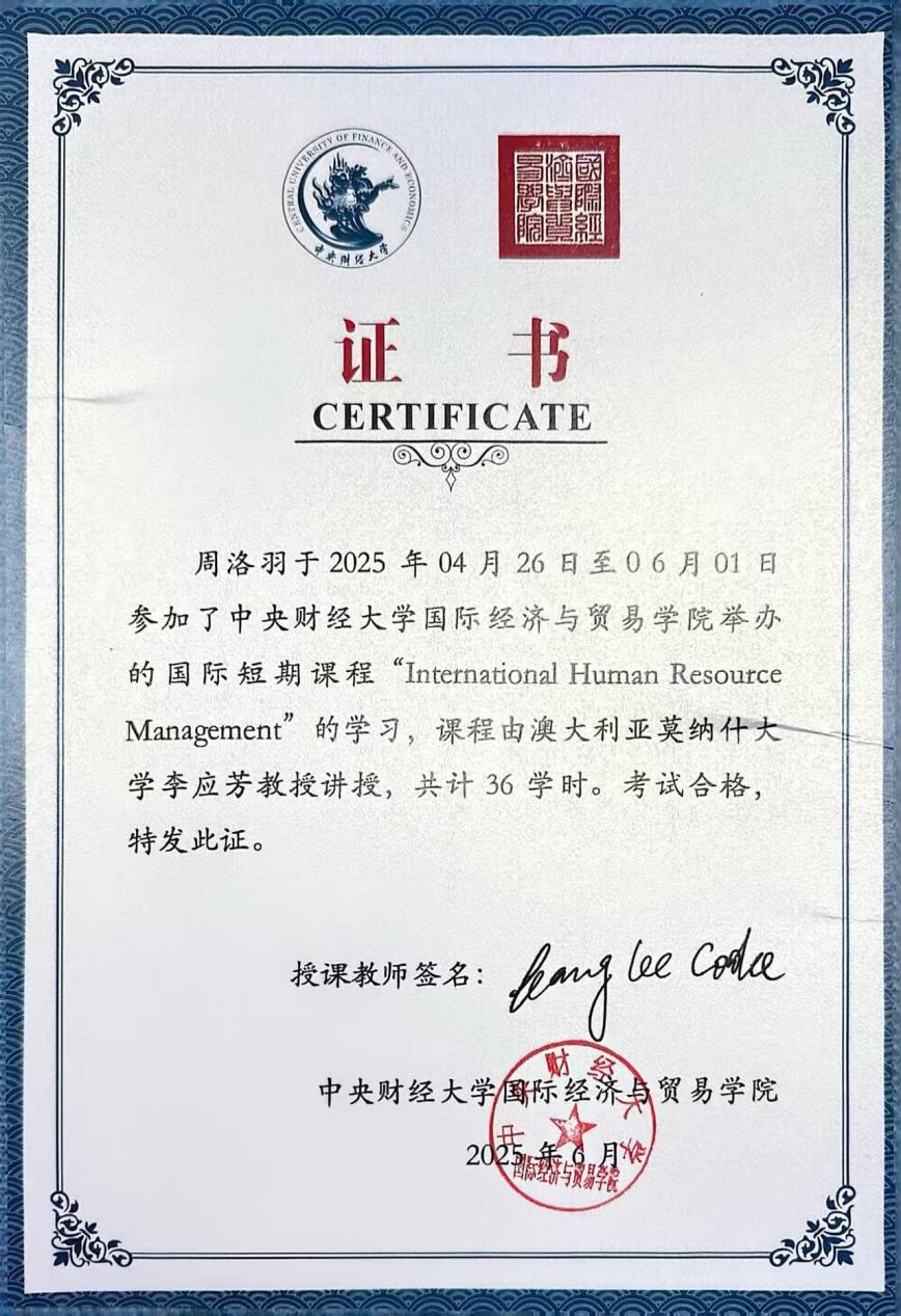 虽然这只是一个短期课程,但它拓宽了我对人力资源管理在企业国际化成功过程中所扮演角色的理解。我特别感谢李教授营造了一个友好、互动性强的学习氛围,并鼓励学生积极表达个人观点。我相信,这门课程所带来的知识和技能,将成为我今后在人力资源领域继续深造和职业发展的坚实基础。