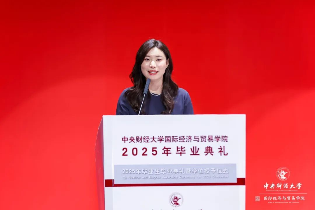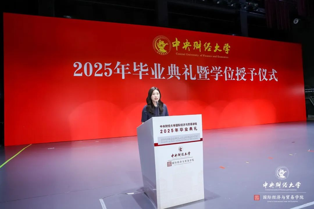 大家好!很荣幸能够在如此庄严、神圣、温情又创意满满的毕业典礼上,代表所有已经毕业的学长学姐们诉说我们的心里话。首先,我们要向精心培育我们的中财国贸学院、一路关爱和陪伴我们的师长亲友表示最衷心的感谢,向圆满完成学业、即将开启人生新篇章的同学们表示热烈的祝贺!