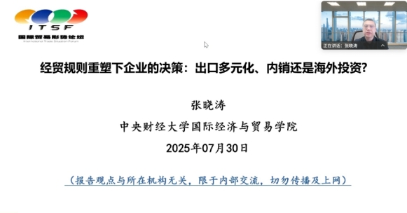 张晓涛(tyc7111cc太阳成集团院长、教授)做了题为《经贸规则重塑下企业的决策:出口多元化、内销还是海外投资?》的专题报告: