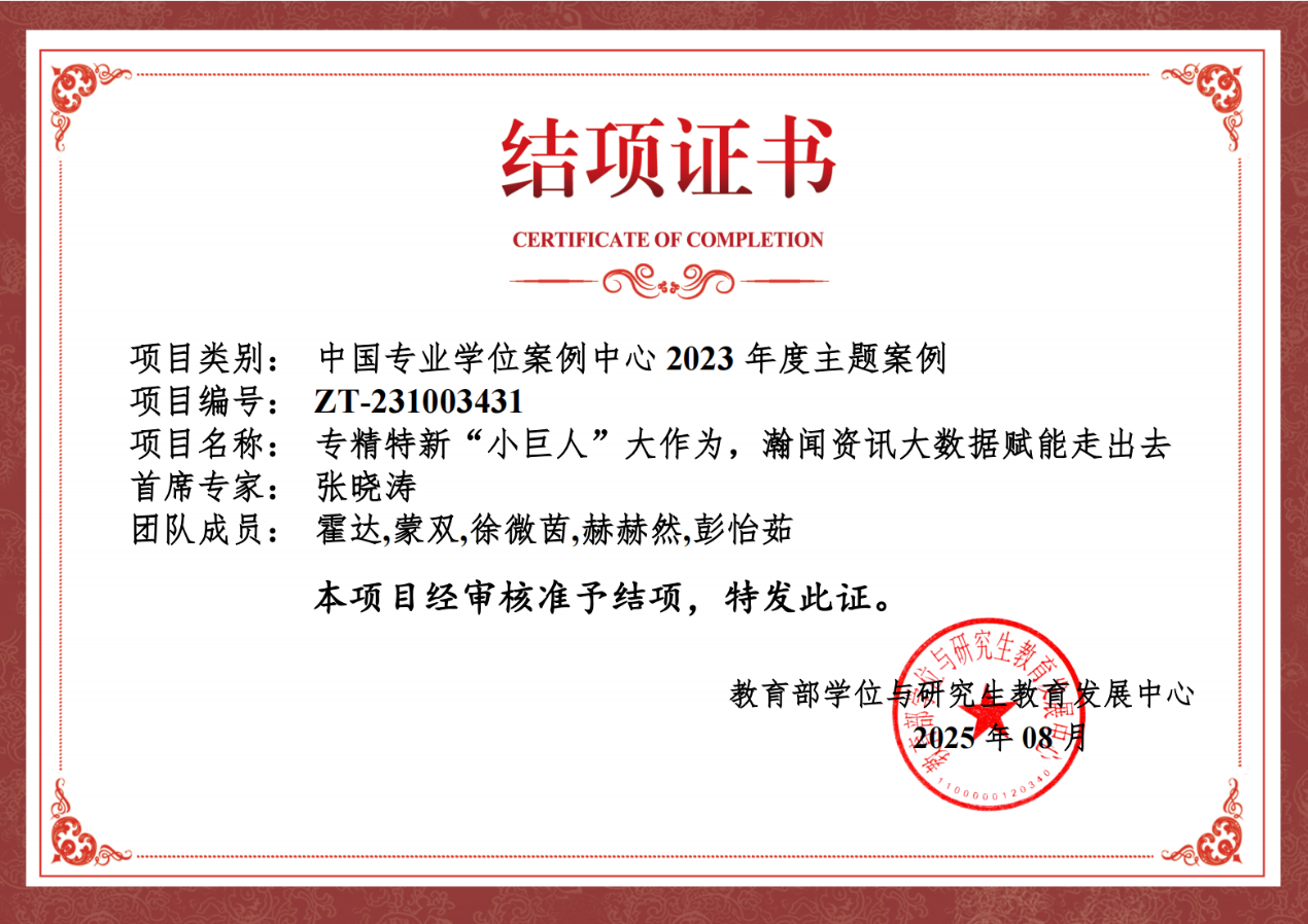 近日,由我院张晓涛教授担任首席专家的教育部2023年度主题案例项目《专精特新“小巨人”大作为,瀚闻资讯大数据赋能走出去》(编号:ZT-231003431)通过教育部学位与研究生教育发展中心评审,顺利结项。团队成员包括霍达教授、蒙双副教授、国际商务专业研究生赫赫然、彭怡茹等。该项目聚焦“走出去”主题,以专精特新企业大连瀚闻资讯有限公司(以下简称“瀚闻资讯”)为研究对象,解构瀚闻资讯与其上游信息来源以及下游服务对象形成的数字生态系统,研究其专有的智能系统和算法为“走出去”企业赋能的独特优势,深入剖析大数据平台如何赋能外贸企业突破国际化壁垒,为推进数字经济赋能贸易强国建设提供学术支撑和典型案例。