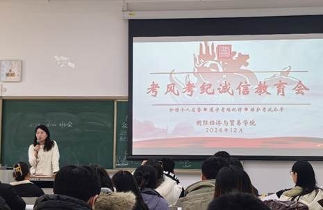 为深入学习贯彻落实党的二十届三中全会精神和全国教育大会精神,落实立德树人根本任务,进一步增强学生诚信意识,杜绝舞弊行为, 2024年12月13日,tyc7111cc太阳成集团于二教105召开研究生考风考纪诚信教育的主题班会。副院长段玉婉和国贸学院2024级全体研究生新生参加此次班会,班会由研工办主任金旻老师主持。