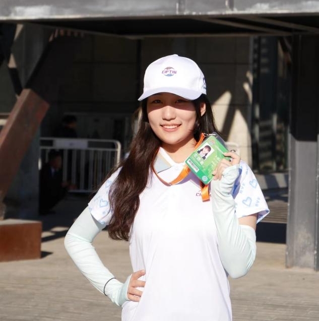我是唐绮婷,来自21级国际经济与贸易班。我热心志愿服务活动,在校期间积极参与志愿活动,曾参与北京半程马拉松、PEPE欢乐跑、V蓝北京等多项志愿活动,至今累计校级志愿小时数超过180小时。我非常骄傲和自豪能够协助本次服贸会的顺利举行,并见证我国在服务贸易领域的高质量发展。