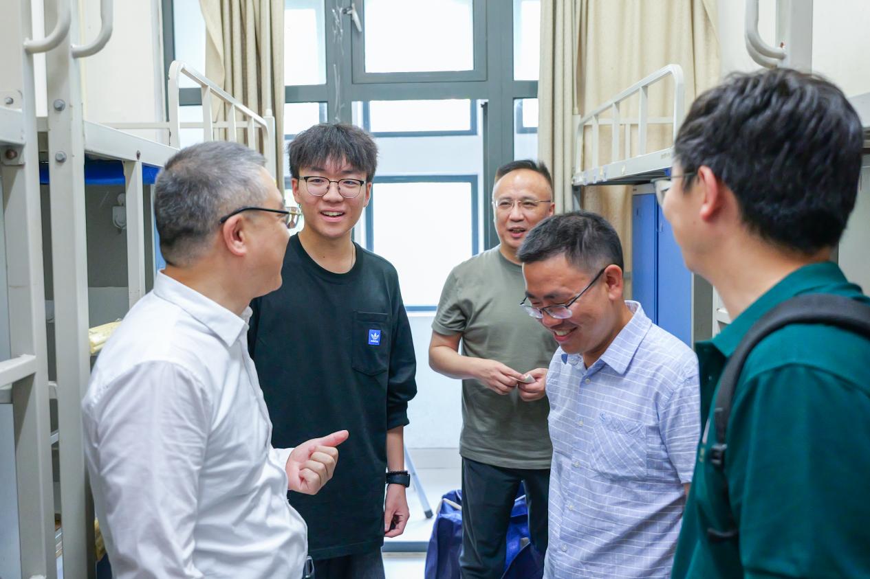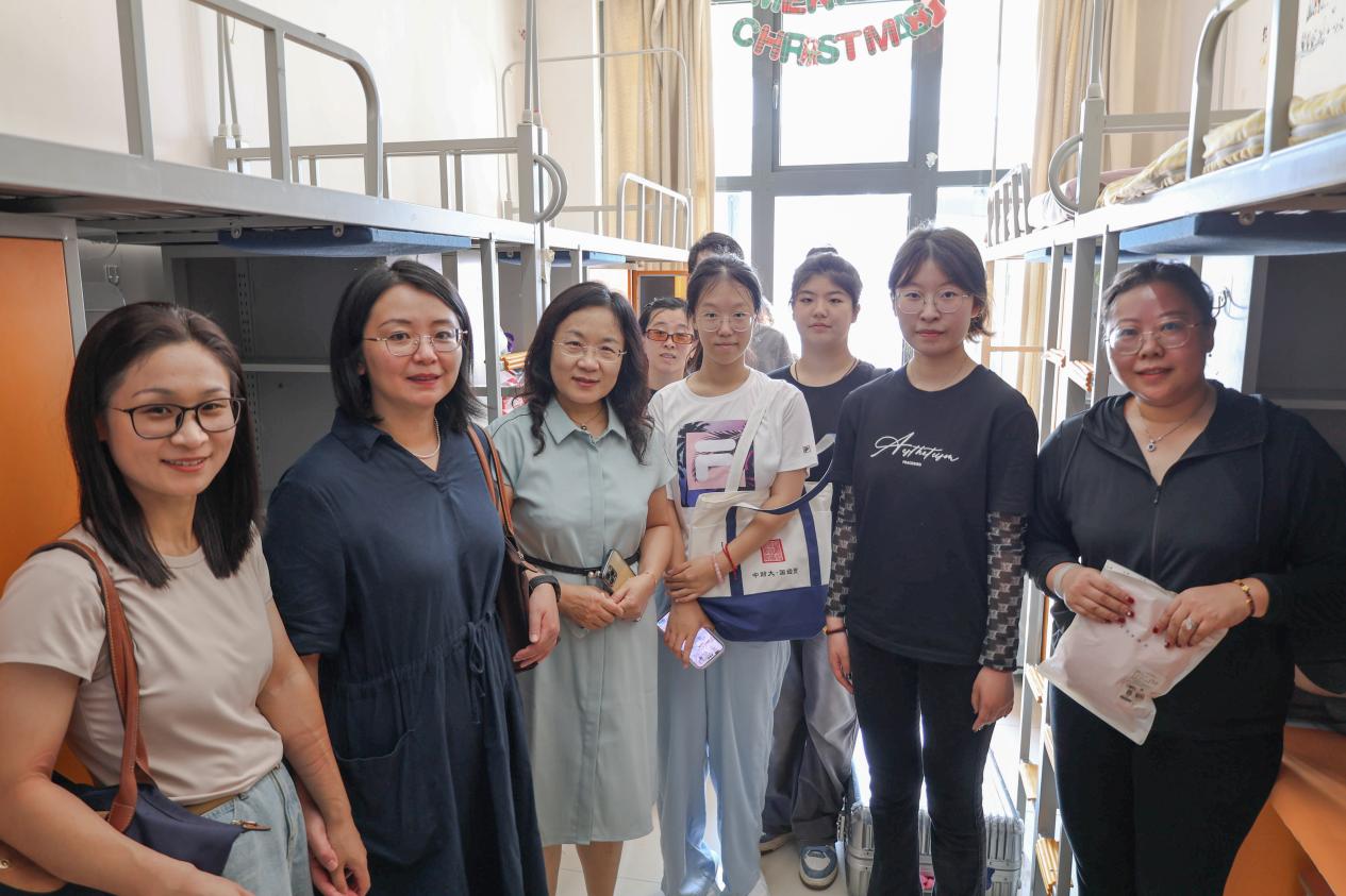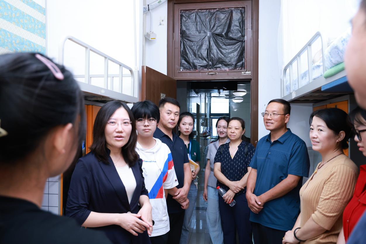 在班主任和新生辅导员的陪同下,副校长朱凌云、学院党委书记徐淼、院长张晓涛、副院长李瑞琴走访了新生宿舍,关心新生们的住宿情况,并对大学生活提出宝贵建议。