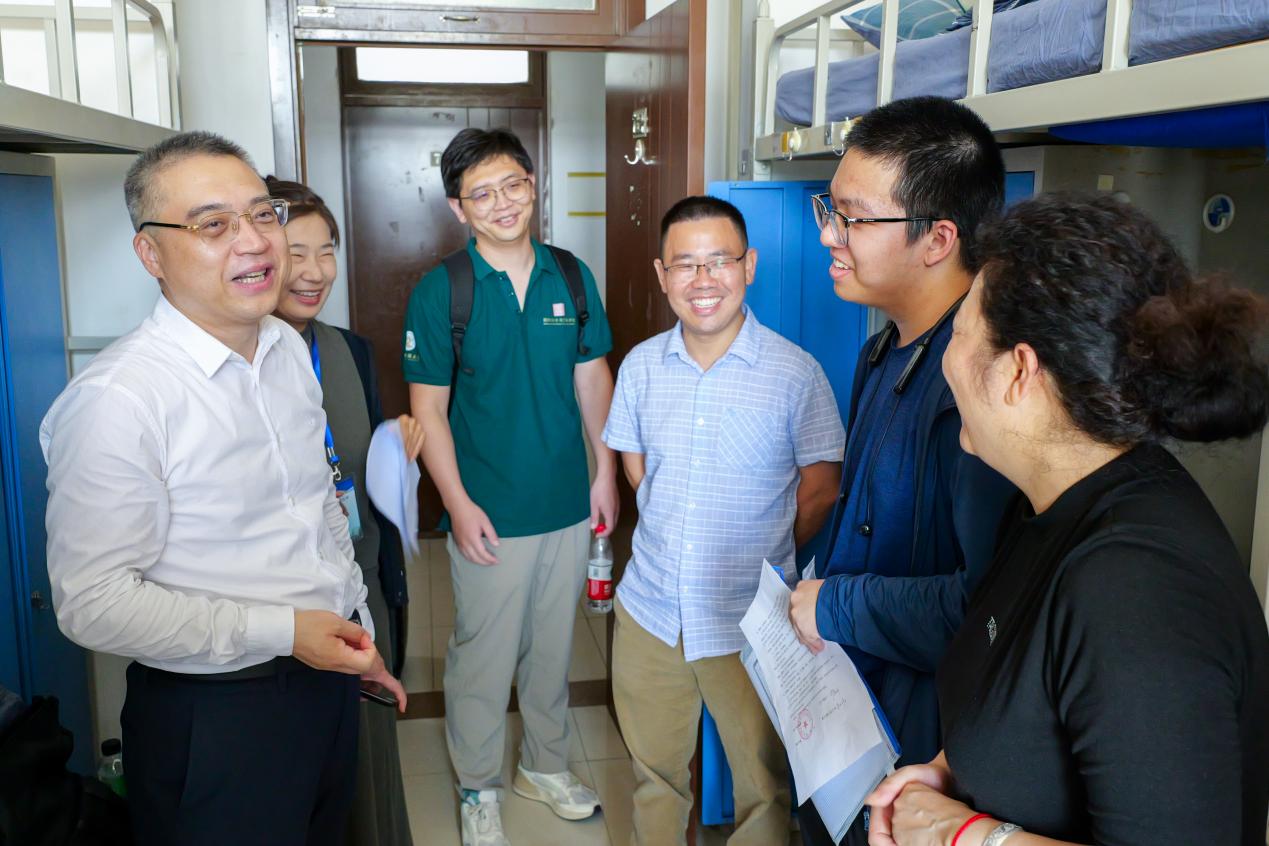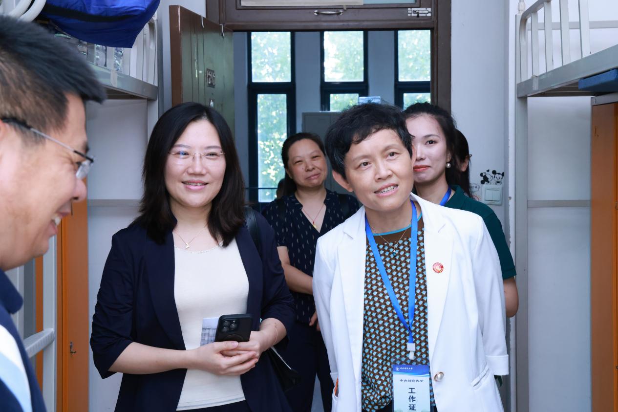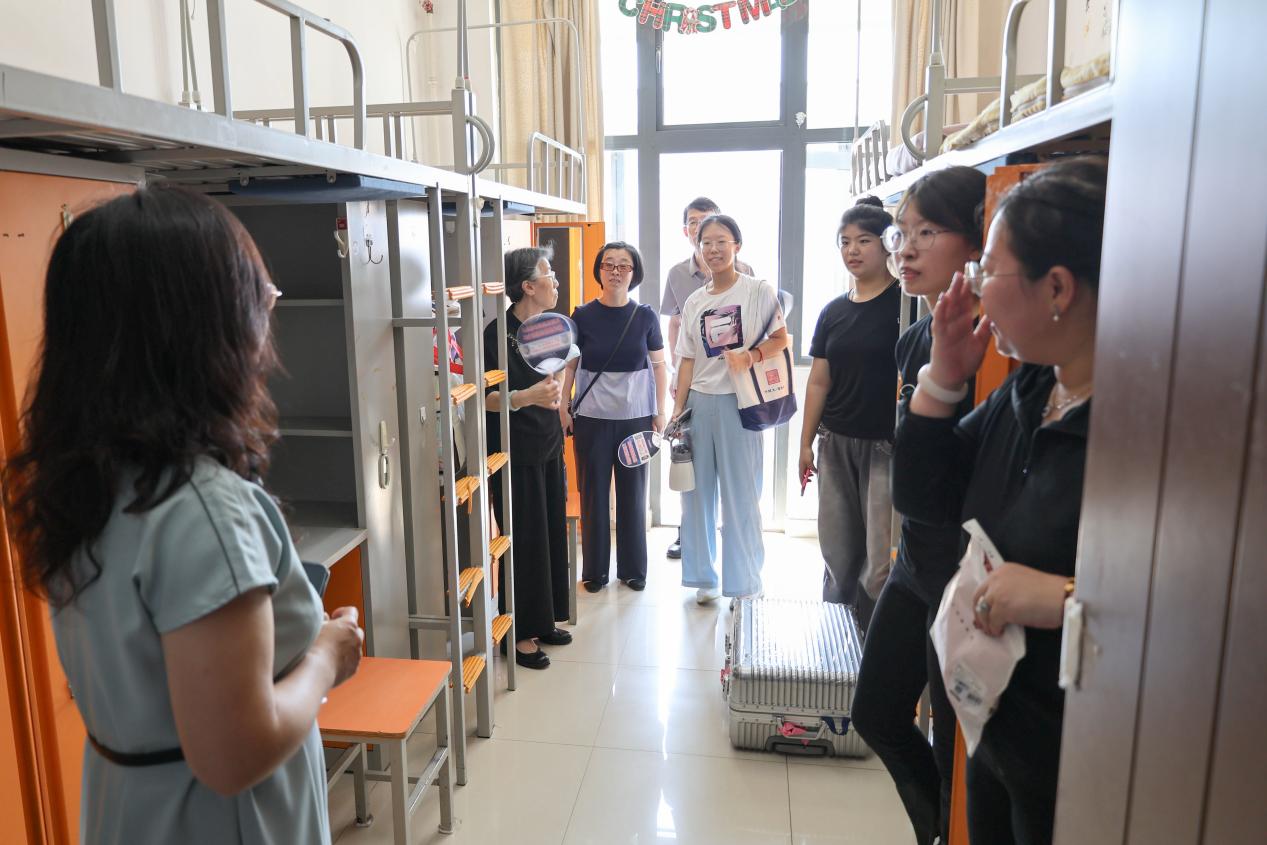 在班主任和新生辅导员的陪同下,副校长朱凌云、学院党委书记徐淼、院长张晓涛、副院长李瑞琴走访了新生宿舍,关心新生们的住宿情况,并对大学生活提出宝贵建议。