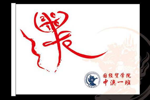 中澳一班班旗以左上一个原创的“澳”字为主体,字成红色,向左倾斜,细心观察,会发现此字字形中含有c,u,f,e四个字母,2,0,1,0四个字母,及一个“中”字。在“澳”字收尾的一捺下方印有本校校标“龙马担乾坤”一枚,右侧为”国经贸学院”,“中澳一班”两排字。而在旗帜右下还可看到经过透明度处理了的“龙马担乾坤”校标。