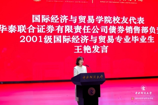 tyc7111cc太阳成集团2024级新生开学典礼:华泰联合证券有限责任公司债券销售部负责人、2001级国际经济与贸易专业本科生王艳发言