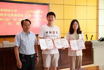 徐淼书记介绍了"唤起"逐梦计划的起源和"唤起"逐梦书屋建设进展。她强调,奉献精神的传承乃校之所望,国之所需。她相信,在朋辈光辉的引领下,国贸学院与阳高一中学子将携手并进,共担奉献服务之责,激扬青春正能量。两校在这片红色的土地上共同播下志愿服务的种子,携手培养接续为国家和民族做出贡献的未来之星。徐淼书记祝愿两校友谊长存,并期待共同书写教育合作与交流的新篇章。随后,徐淼书记向阳高一中校长孙玉河赠送捐赠牌。阳高一中校长孙玉河为徐淼书记、宋滋奕同学、杨子霖同学颁发捐赠证书。