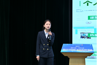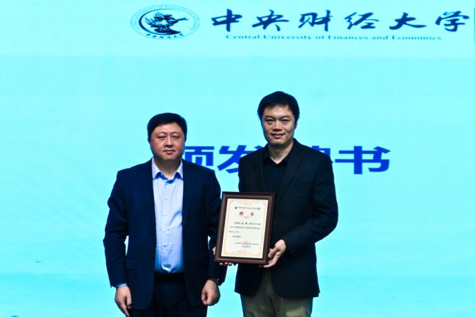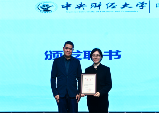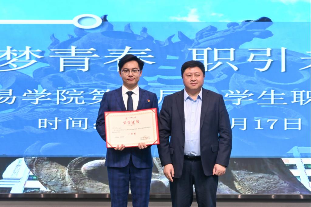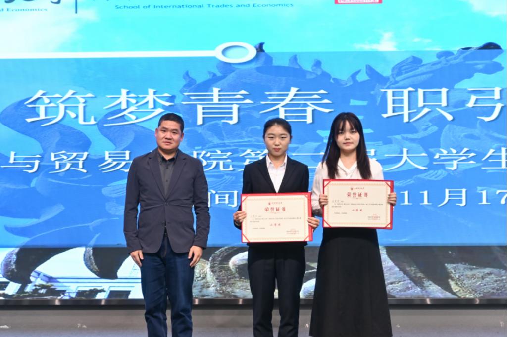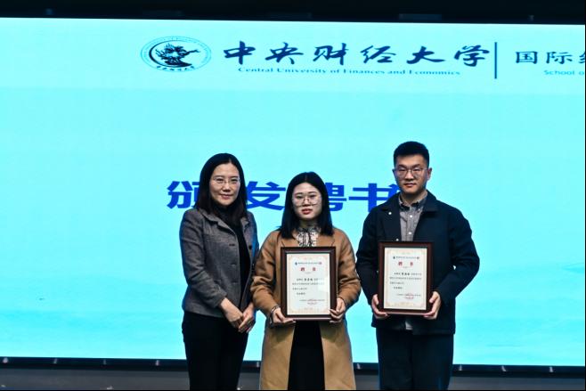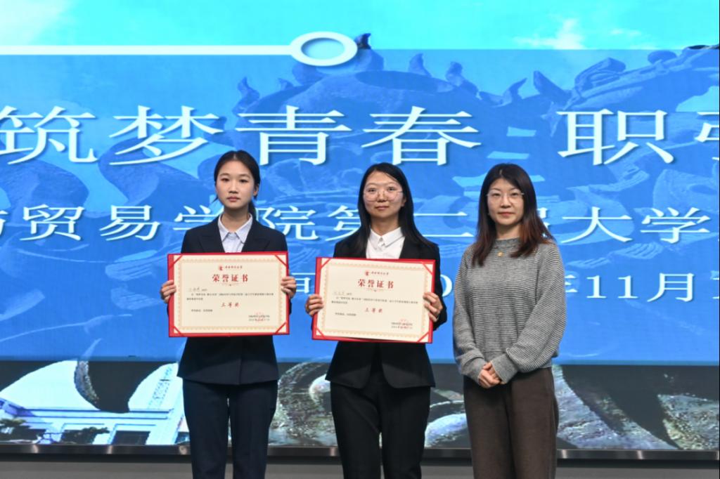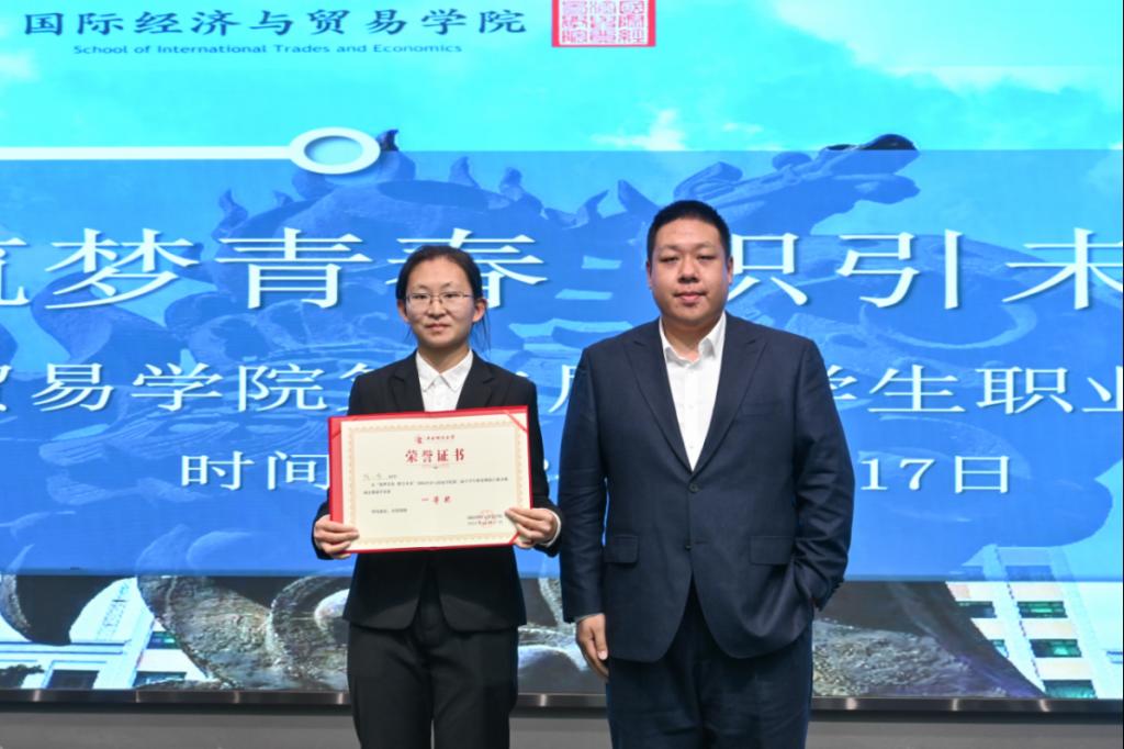 学院2012届国际贸易学(国际商务方向)校友、中国银河证券财富管理总部企业客户部高级业务经理徐颢为就业赛道二等奖获奖选手颁奖