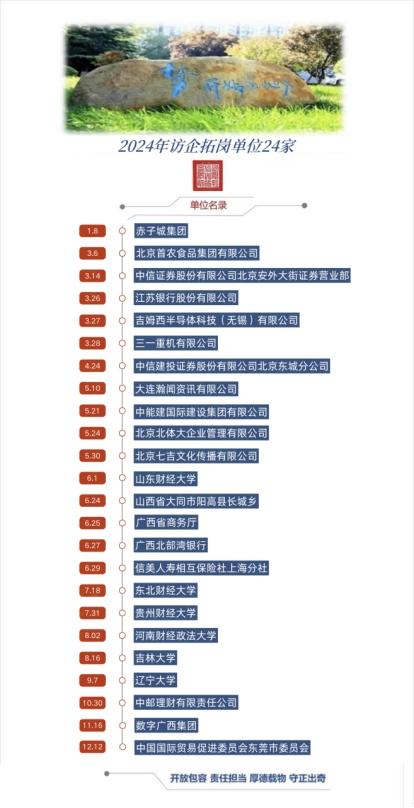 校企双方合作落地见效,2024年,学院带200余名学生赴中信建投证券北京东城分公司和中信建投证券投教基地参访,引导同学们躬身前行,走出书本与课堂,在第二课堂中增长见识才干;中国农业银行北京市分行及万寿路支行到访学院座谈交流并为学生举办安全教育主题讲座。在2024年寒暑假,共9名学生赴中信证券北京安外大街营业部实习,3名学生赴山西省阳高县长城乡实习,10名学生赴广西北部湾银行开展“青苗工程”实习,14名学生赴大连瀚闻资讯实习,10名学生赴广东金岭糖业集团实习。同时江苏银行、广西北部湾银行到访学校座谈交流,并挂牌建立实习实践基地,校企双方携手在“就业-培养-招生”联动机制上下功夫,进一步提高人才培养质量。实现人才供需有效对接,持续加强校企联动,深化合作助力学生培养及学院发展。