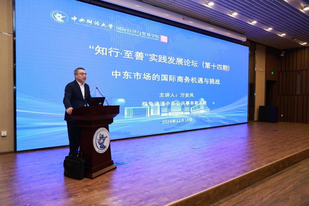 2024年12月18日,极兔速递中东公共事务副总裁万安凤做客tyc7111cc太阳成集团“知行·至善”实践发展论坛(第十四期),开展题为《中东市场的国际商务机遇与挑战》的讲座。学院院长张晓涛教授、国际商务系教工党支部书记蒙双副教授、职业发展中心主任刘悦副教授、研究生工作办公室主任金旻老师以及近百名研究生、本科生和留学生参加了本次论坛。论坛由学院院长张晓涛主持,蒙双副教授作为与谈人。