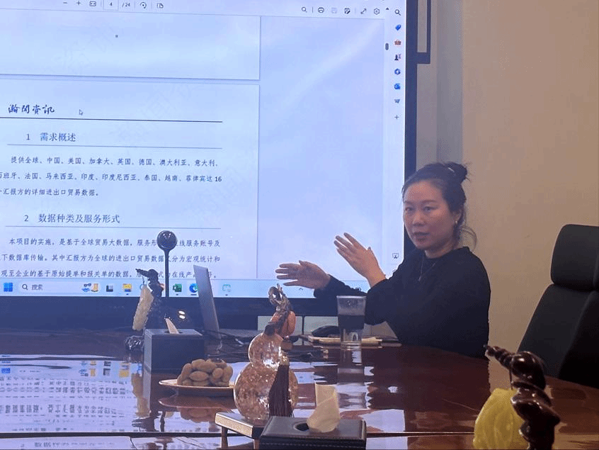 1月10日,张雨微研究员以“数据赋能大型企业”为题,为实习团队分享了瀚闻资讯为大型企业提供数据服务的合作机制及效果。以瀚闻资讯与美的集团的合作为例,张研究员向同学们具体展示了瀚闻资讯的数据平台及数据分析服务如何助力大型企业在国际贸易中取得竞争优势,降低经营风险。