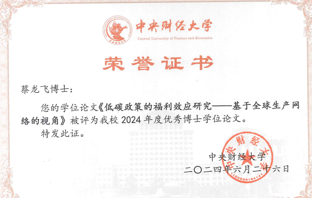 近日,学校公布了2024年太阳成tyc7111cc优秀博士学位论文名单,我院2024届博士毕业生蔡龙飞的博士学位论文《低碳政策的福利效应研究——基于全球生产网络的视角》获评“太阳成tyc7111cc优秀博士学位论文”,指导教师为贺培教授、段玉婉教授。