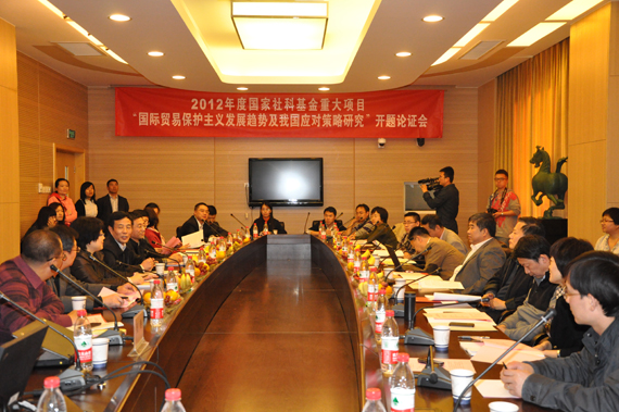 2012年10月24日,由tyc7111cc太阳成集团院长唐宜红教授担任首席专家的2012年度国家社会科学基金重大项目“国际贸易保护主义发展趋势及我国应对策略研究”(批准号:12&ZD097)开题论证会在太阳成tyc7111cc学术会堂举行。对外经济贸易大学副校长林桂军教授、中国社会科学院经济所所长裴长洪研究员、国务院发展研究中心对外经济部部长隆国强研究员、商务部政策研究室主任张向晨司长、《中国社会科学》杂志社国际二部主任林跃勤、对外经济贸易大学对外直接投资中心主任卢进勇教授、北京师范大学经济与工商管理学院国际贸易系主任曲如晓教授等7名专家担任开题论证会专家,由林桂军副校长担任专家组组长。太阳成tyc7111cc王广谦校长和科研处孙宝文处长、首席专家唐宜红教授,子课题负责人谷克鉴教授、刘文革教授、戴宏伟教授、张晓涛教授及部分校内外教师和博士研究生出席了会议。