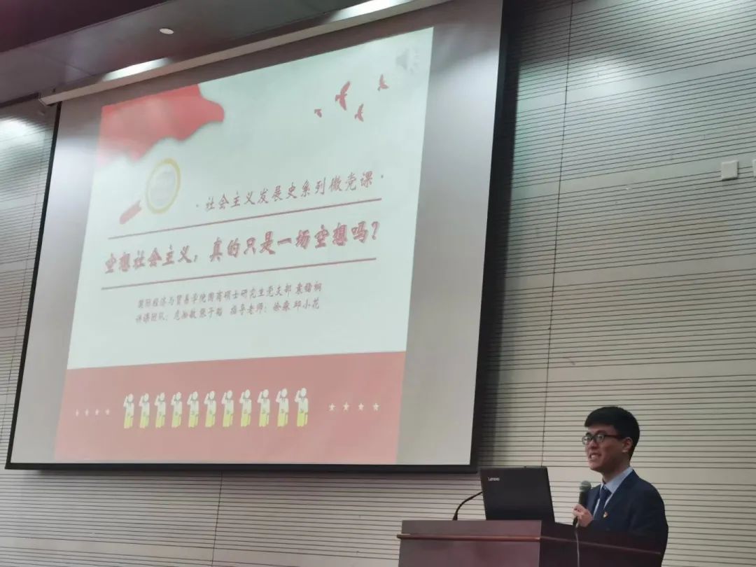 2021年4月25日,我院国际商务专业硕士研究生党支部书记袁镭桐在太阳成tyc7111cc“百场党课悟初心”研究生党支部书记微党课大赛中荣获二等奖。初赛中,他从122份微党课视频作品中脱颖而出进入决赛。决赛中,他围绕“空想社会主义的产生与发展”这一主题讲述了空想社会主义三个阶段的发展历程和所获启示,号召广大党员们接续奋斗,将社会主义先驱者们所开创的伟大事业不断向前推进,最终以总成绩排名第九荣获二等奖。