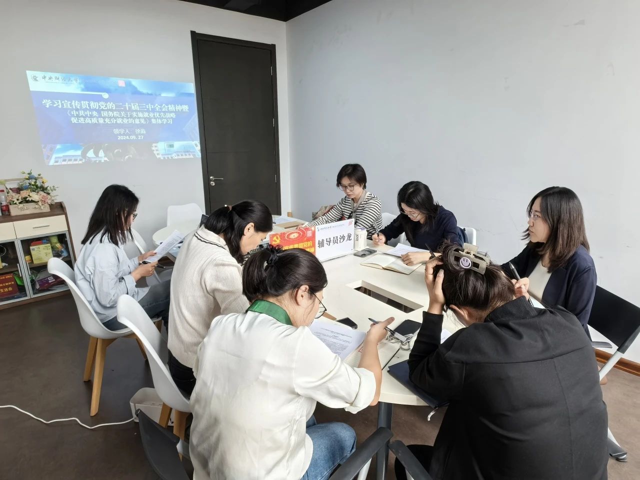 为学习贯彻党的二十届三中全会精神和全国教育大会精神,积极响应党中央、国务院关于做好高校毕业生就业工作的决策部署,全方位助力学生成长成才,促进毕业生高质量充分就业,9月27日下午,国经贸学院在13号楼440会议室举行2024年辅导员沙龙理论学习专题第四期活动暨《中共中央 国务院关于实施就业优先战略促进高质量充分就业的意见》集体学习研讨,由学院党委书记徐淼领学,学院就业专员、2023级本科生辅导员施立萍做“就业观念引导类案例的基本处理方法与技巧”专题汇报。学院助理教授、本科生班主任唐爱迪,全体本科生辅导员参加本期辅导员沙龙。