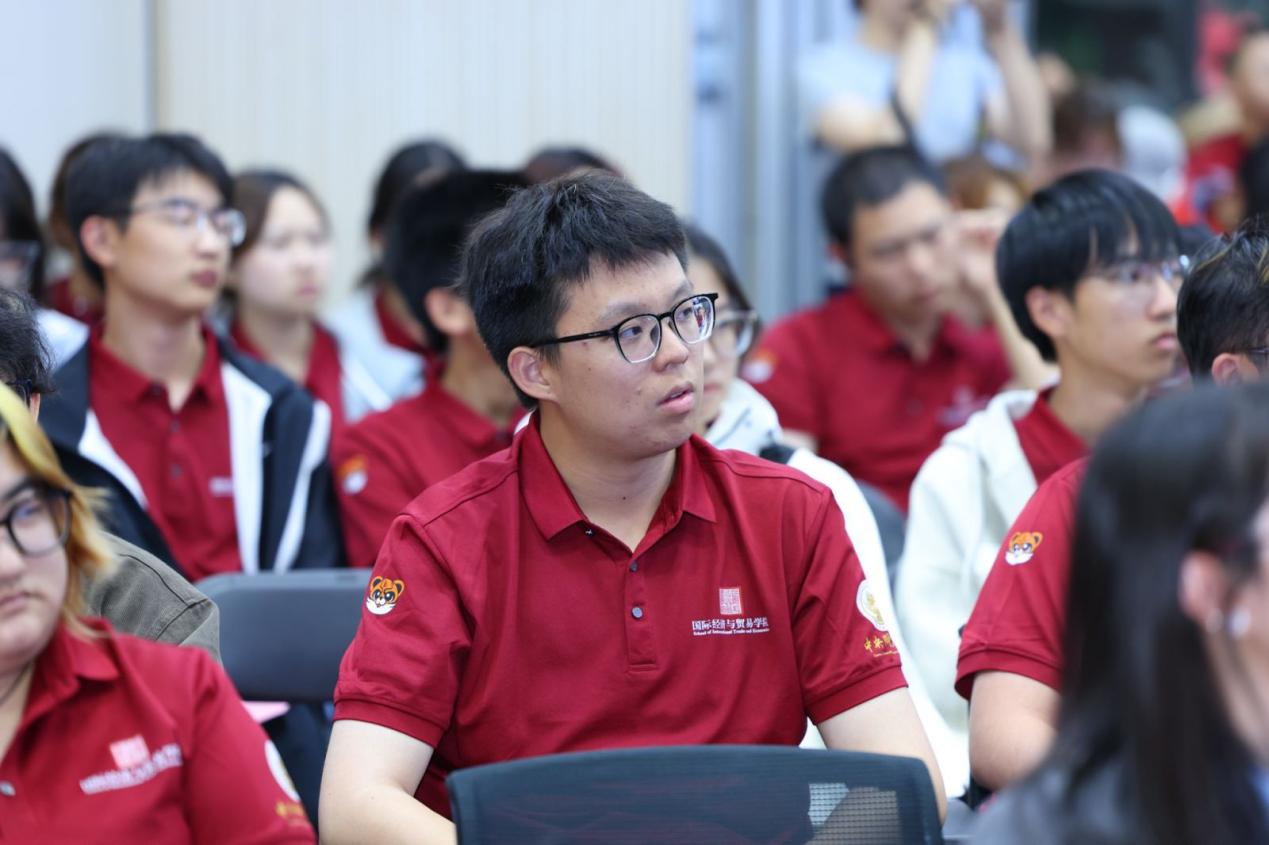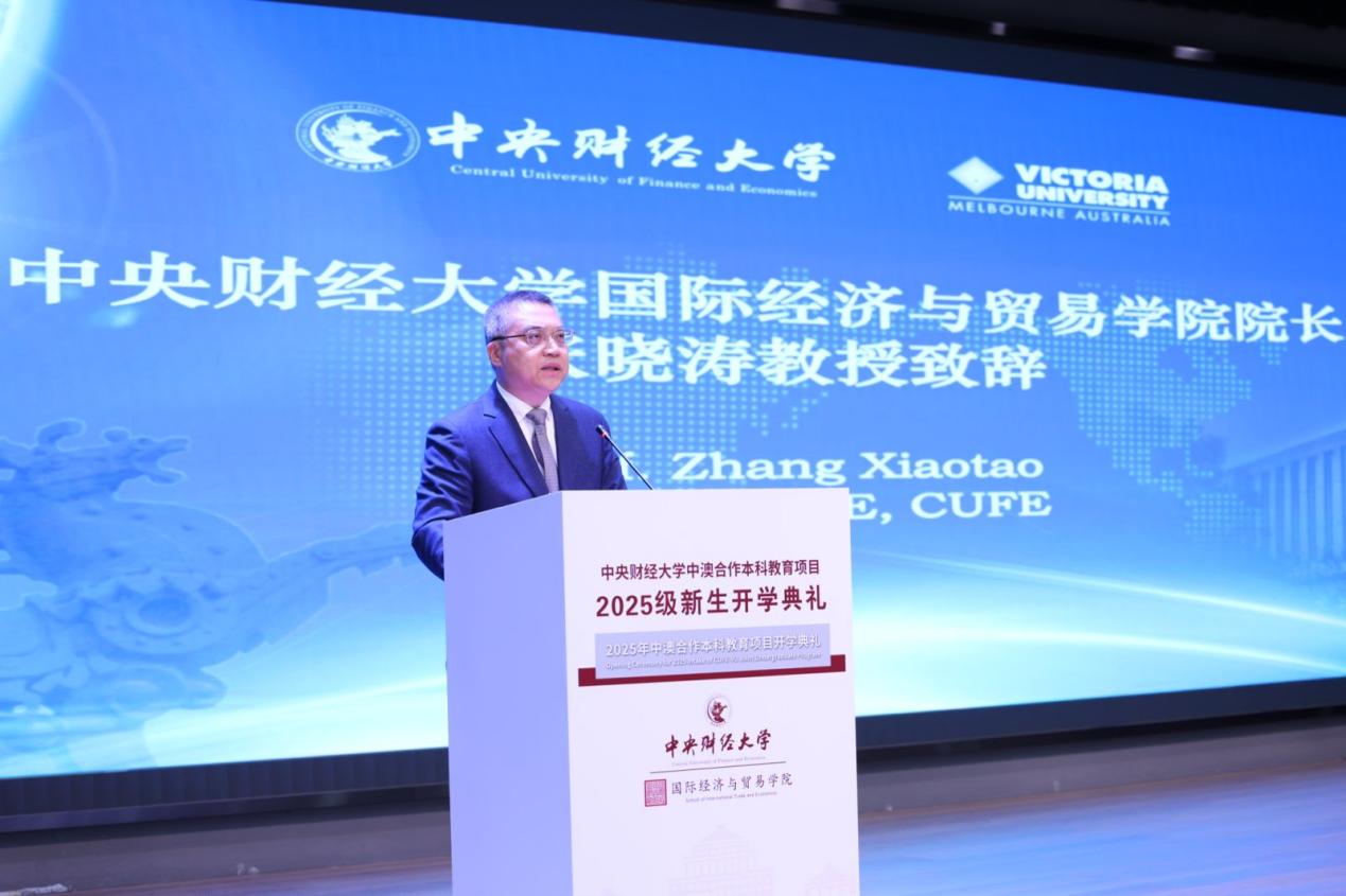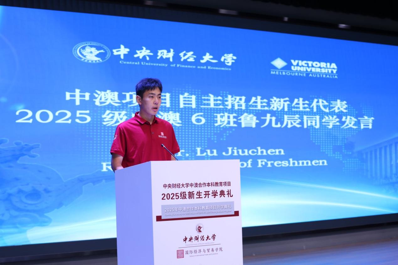 中澳项目统招生新生代表2025级中澳2班赵芳其同学发言。她表示,在百年变局加速演进的时代背景下,国贸学子应主动承担使命,努力成为融通中外、具有家国情怀和全球视野的复合型人才。最后,她呼吁同学们保持求知热情、投身实践创新、树立远大理想,珍惜校际资源与学院环境,力争通过四年学习成长为能够服务国家战略、参与全球治理的高层次经贸人才。