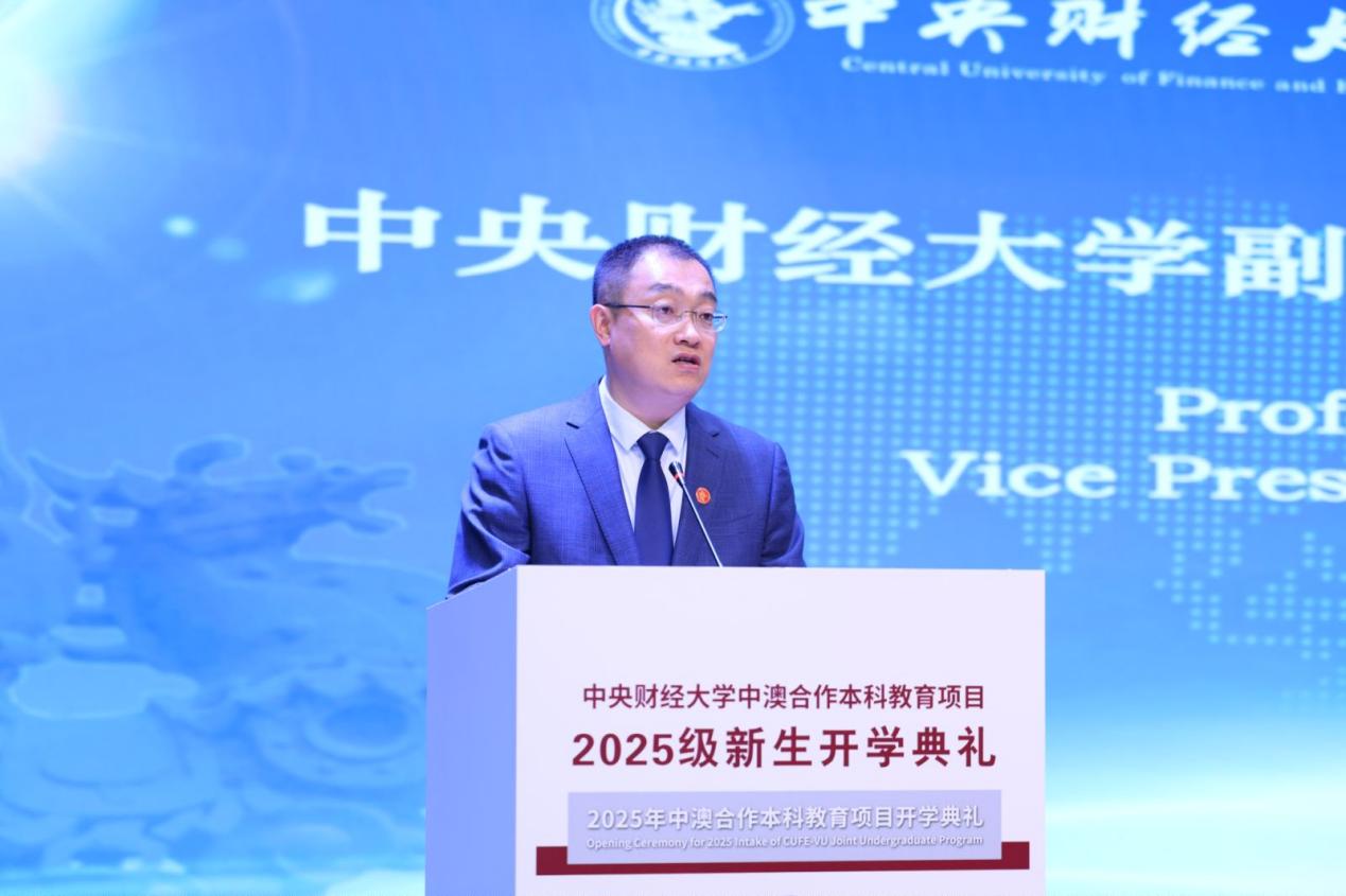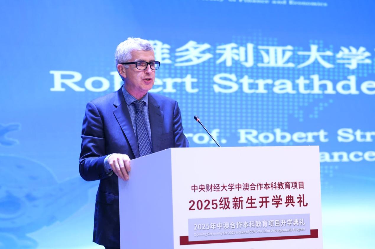 维多利亚大学副校长罗伯·斯特拉蒂教授致辞。他代表维多利亚大学校长及全体教职员工,向2025级新生表示最热烈的欢迎与诚挚的祝贺。中澳项目作为高水平合作办学平台,始终致力于为学生提供中国顶尖的国际教育体验,不仅帮助大家系统掌握前沿的全球知识与专业能力,也注重引导学生与祖国的社会文化根基保持紧密联系。维多利亚大学以“多元包容、追求卓越”为核心理念,高度重视每一位学生的职业发展规划与实习实践环节,办学实力在国际上广受认可,在《泰晤士高等教育》世界大学排名中稳居全球前2%。他衷心希望同学们充分利用该项目优势,积极构建跨文化人际网络,不断提升综合素养与全球竞争力,在多元环境中锻炼成长,为未来成为具备国际视野的高素质专业人才打下坚实基础。