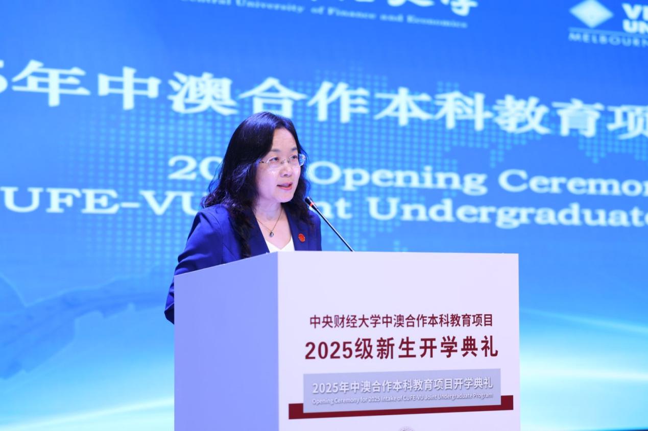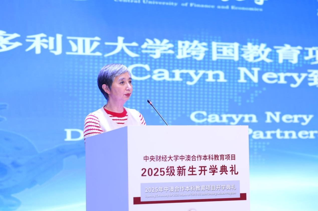 维多利亚大学跨国教育项目(TNE)主任卡琳·内里致辞。她代表维多利亚大学欢迎新生加入这一联合项目,强调该项目旨在为学生提供国际认可的教育,融合中西方商业环境的教学优势,培养具有全球视野的专业人才。她指出,该项目具有三大特点:全英文授课、现代教学方法以及前沿商业技能培养,毕业生将获得两国认证的高质量学位。校方承诺提供全方位支持,包括学术指导和课外资源,并鼓励学生利用交流机会赴澳学习。最后,她勉励新生继承项目二十余年的学术传统,不仅成就个人发展,也为全球社区做出贡献。